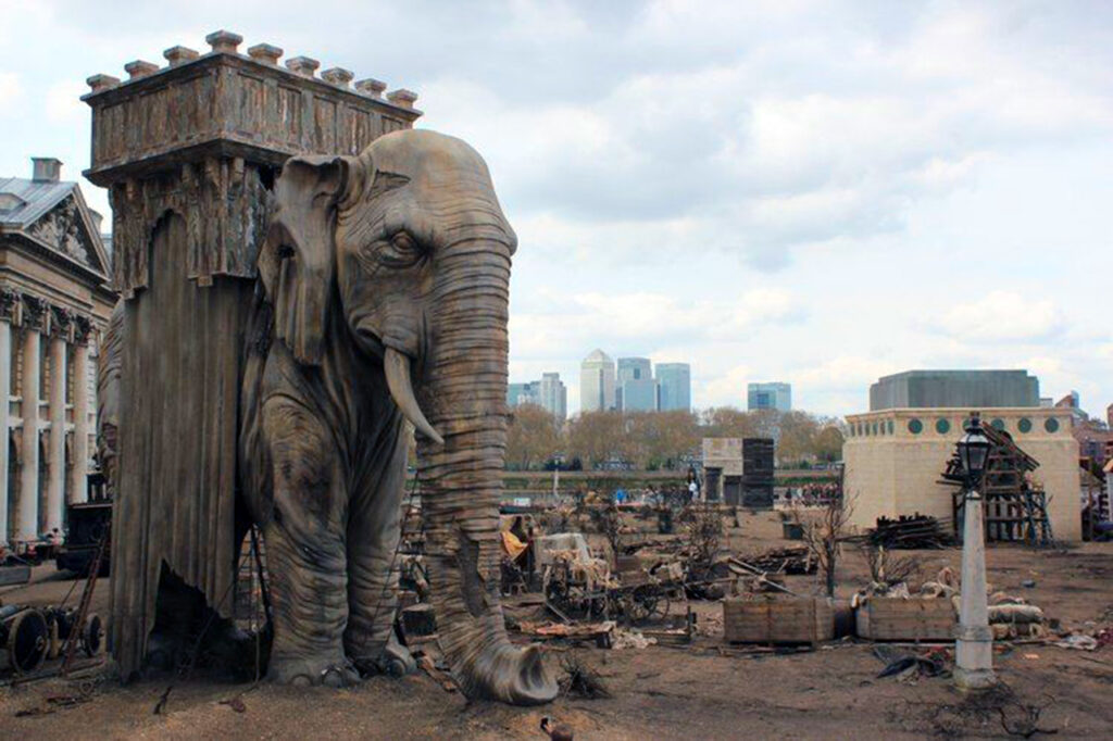 Depiction of the abandoned plaster model of the Elephant of the Bastille (Gavroche’s home) from the 2012 film adaptation of the novel